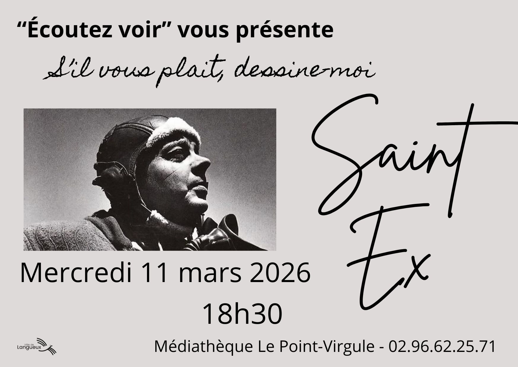"Écoutez-voir" propose un portrait d'Antoine de St Exupéry à travers ses mutliples facettes . De son enfance à son dernier vol : l'aviateur, l'écrivain, le reporter, l'amoureux... Des textes lus à plusieurs voix et mis en espace.